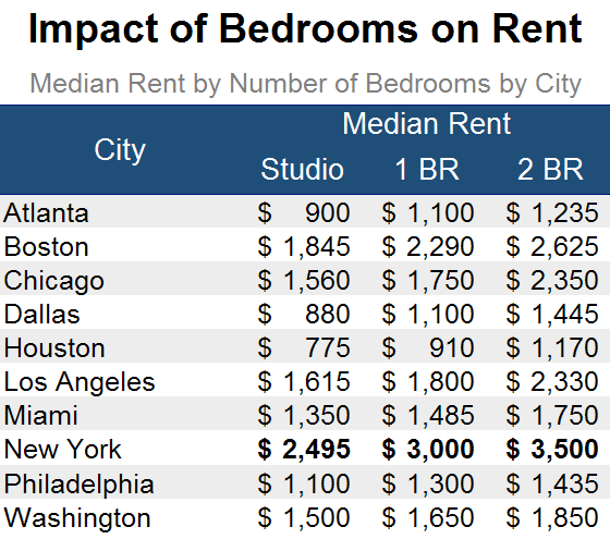The top three most expensive cities remain the same across all categories, but on the other end of the spectrum there are some differences. While Atlanta, Houston, and Dallas has similar one-bedroom pricing, Dallas has a higher pricing for two bedrooms.
