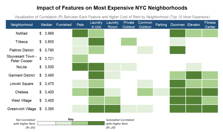 Rather than present raw numbers, we’ve color coded the results. A darker green indicates a stronger correlation with higher monthly rent.